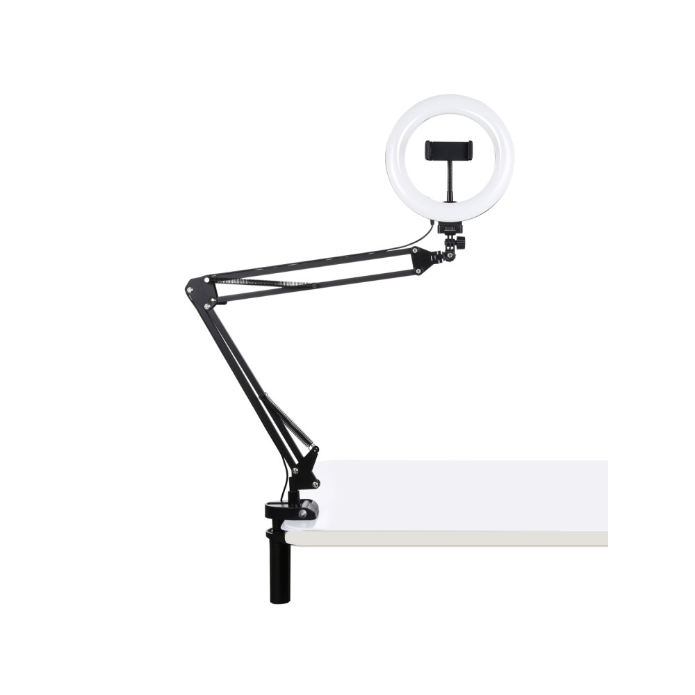 The set includes a foldable stand with a flexible arm, made of durable metal material. The stand offers a freely adjustable height and the option of 180-degree or 360-degree adjustment, ensuring comfort when handling. Double springsIny suspensions on each arm protect the ring light from sudden drops, while the flexible mount allows easy viewing of the device from any angle.