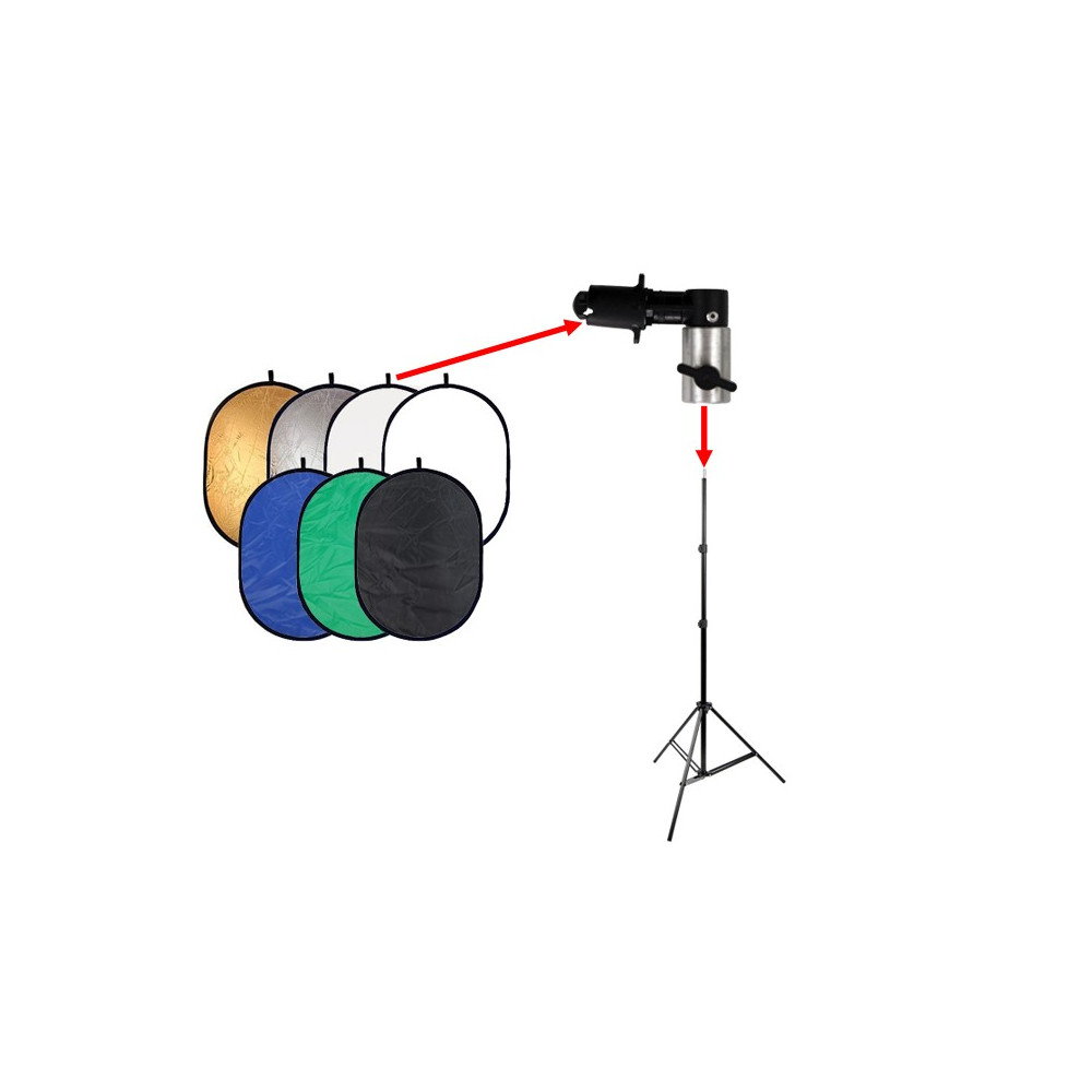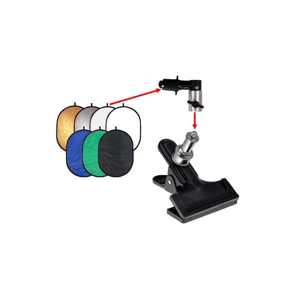 Multifunctional holder with the possibility of mounting a reflective plate or background on a tripod with 16mm studio tip .