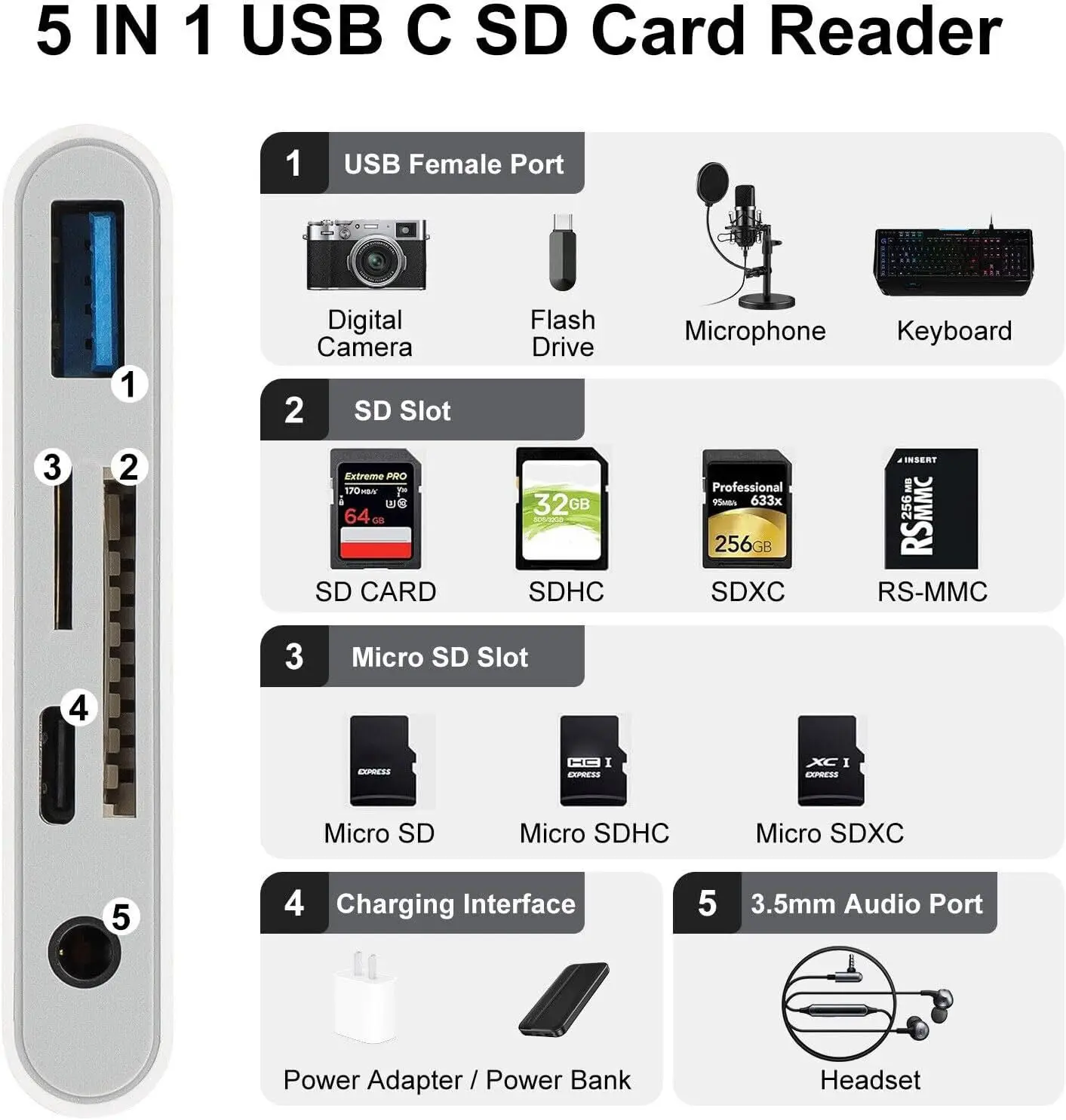 Multifunctional adapter/reader SD, TF card + USB + USB-C + Jack 3.5 mm for devices with USB-C connector is the ideal solution for those looking for a versatile and efficient way to expand the capabilities of their mobile devices. This adapter is designed to meet all your connectivity and data transfer needs, with maximum speed and convenience.