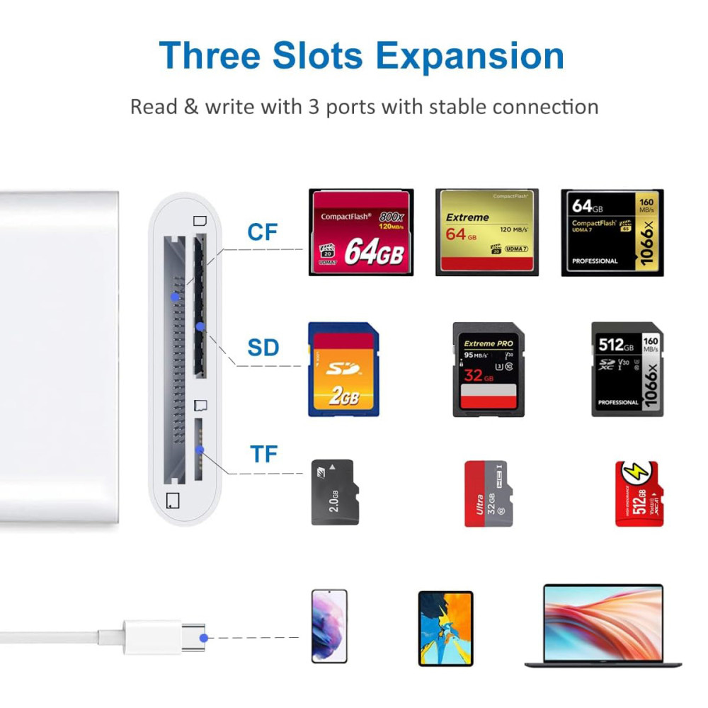 The SD, CF, TF memory card reader for devices with USB-C connector is an essential accessory for those who need fast and efficient data transfer between their devices. This product is designed to meet all your needs when working with different types of memory cards, without the need for complicated setup. With its simple plug and play design, there is no driver or app to install, meaning you can start transferring data immediately without any hassle.