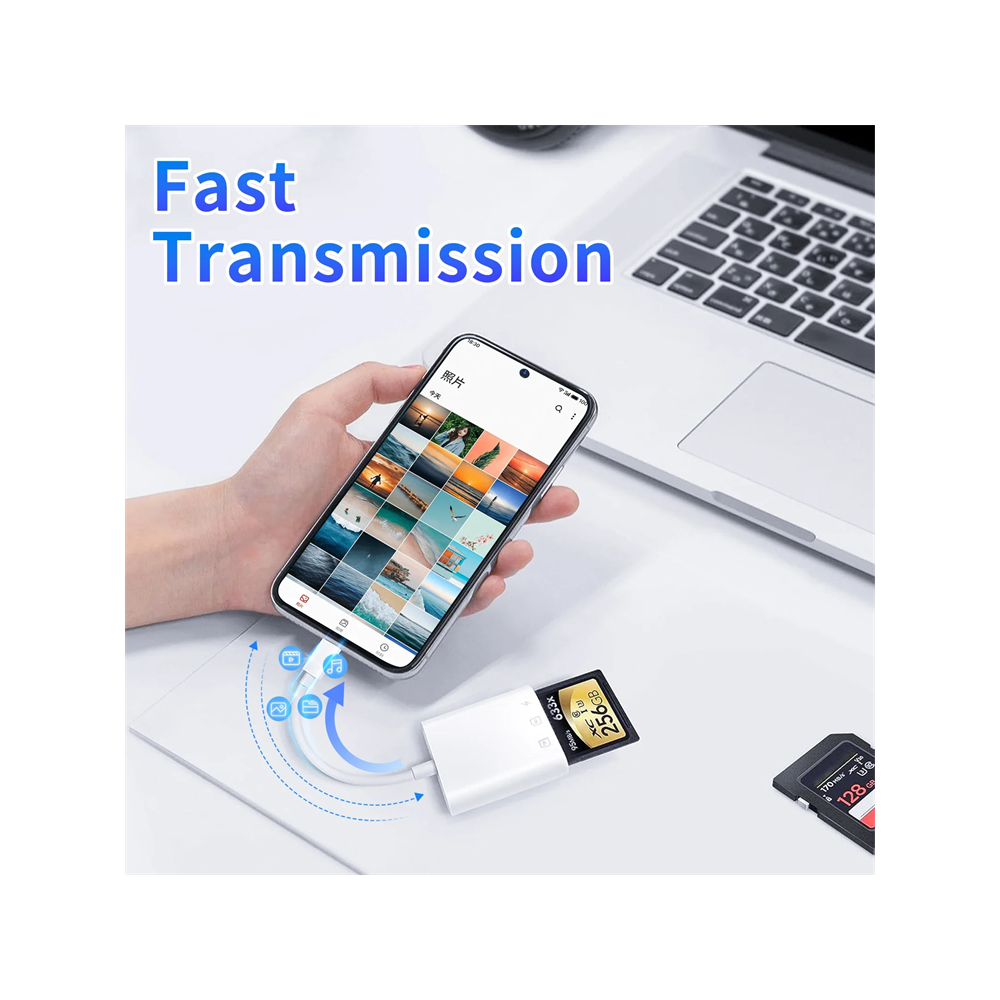 The SD, TF + Lightning memory card reader is the ideal solution for users of Lightning devices such as iPhones who need to efficiently manage their multimedia files. This 3-in-1 adapter offers fast data transfer speeds of 20MB/s to 30MB/s, making it much easier and faster to transfer photos and videos between memory cards and your device.