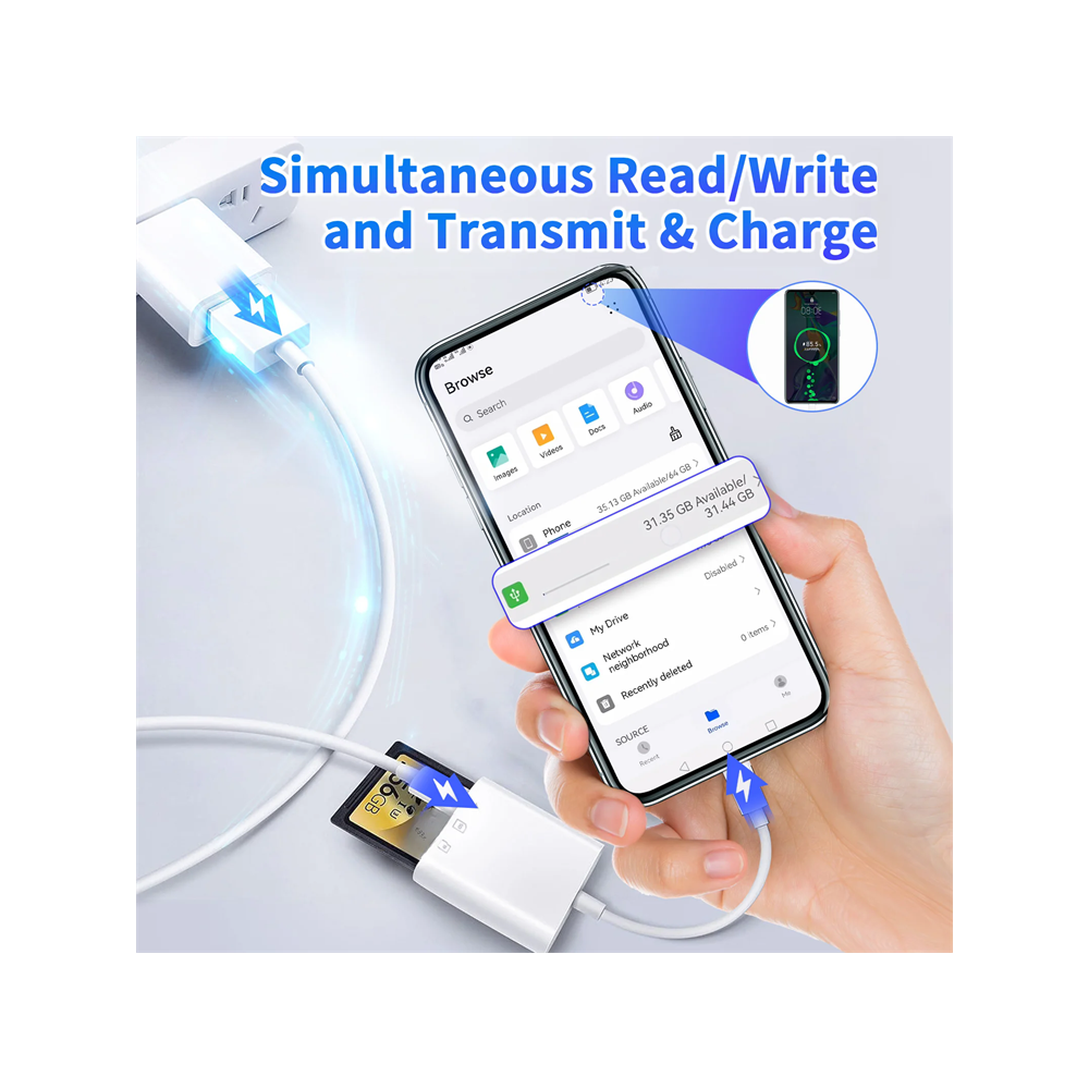 With two slots for SD and Micro SD (TF) cards, you have the flexibility to work with different types of memory cards. In addition, the adapter is equipped with a charging port that allows simultaneous charging of the device and data transfer, which is especially practical for extended use or when working on the go.