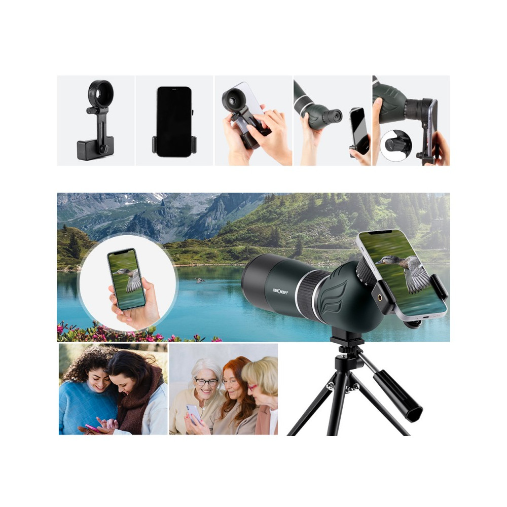 Includes a mini tripod with metal feet and non-slip pads to ensure stability and precise aiming. The smartphone mount allows you to easily connect your phone, allowing you to take photos and videos directly through the binoculars. The kit also includes a carrying case with shoulder strap for easy handling.