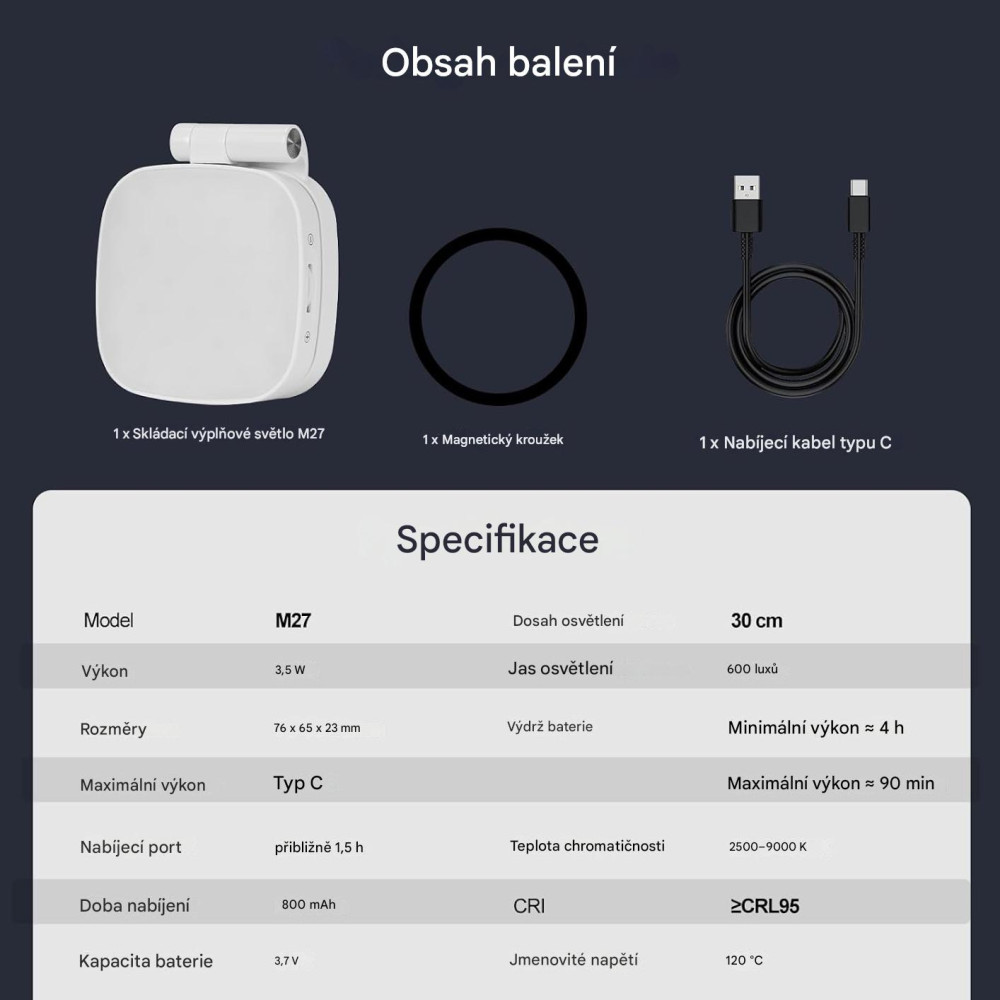 The M27 is designed to be easily portable and portable. It measures just 6 x 7 x 2 cm when folded and weighs 80-96 g, making it easy to slip into a pocket or purse. Plus, thanks to the flip-up design and telescopic arm, you can adjust the light so it doesn't interfere with your camera lens or use it as a phone stand.