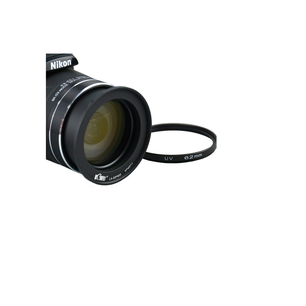 The Kiwifotos LA-62P600 is designed for Nikon Coolpix P600 P610 and P610S cameras. 62mm diameter filters can be attached, including the 62mm cap. Package contents : 1x LA-62P600 reducer
