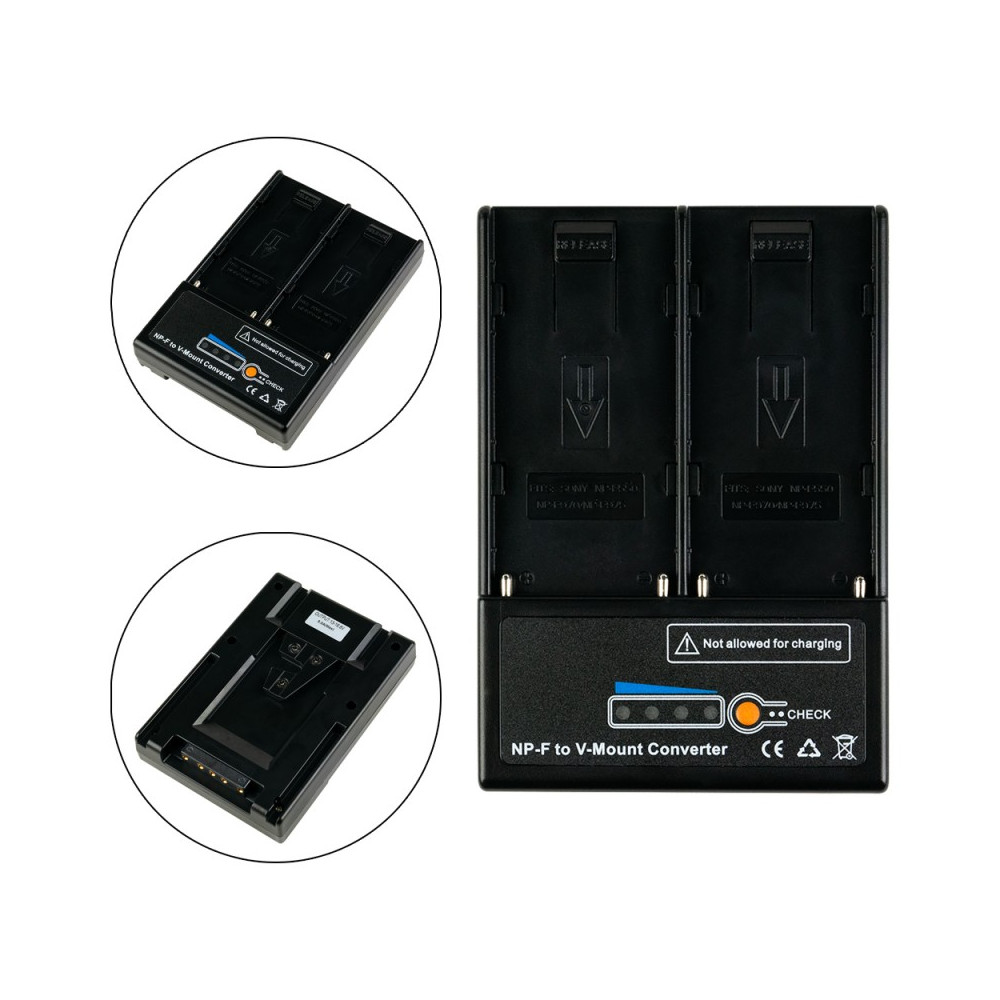 The 2 × NP-F - V-Lock/V-Mount Adapter is a versatile and practical accessory designed to meet the needs of photographers, videographers and lighting technicians. It allows you to connect two NP-F batteries (e.g. NP-F550, NP-F750, NP-F970) to the V-mount socket, allowing you to conveniently and safely power your lighting equipment and cameras from the more popular and readily available cells.