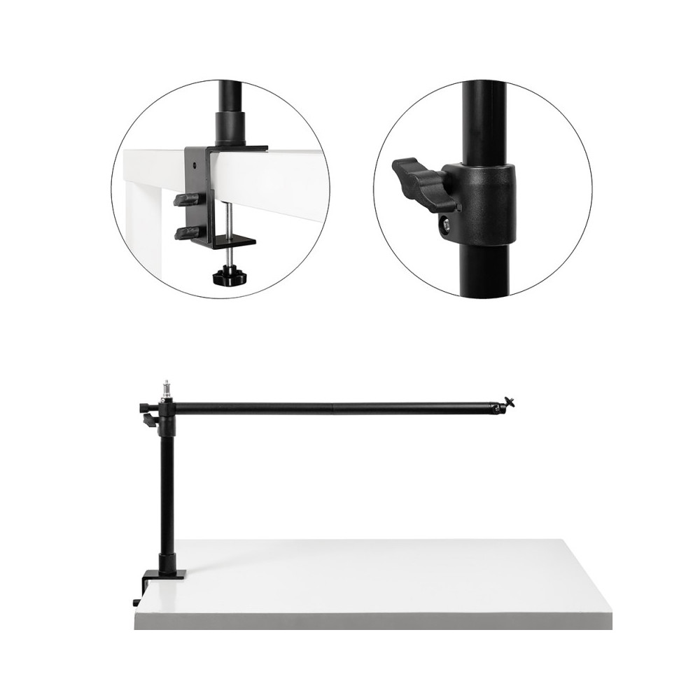 Thanks to the 16mm studio head with 1/4'' thread, the tripod is not only ideal for mounting studio lamps, but also for ring or cosmetic lamps. The clamp allows for mounting on a work surface with a maximum width of 9 cm, providing a stable base for whatever equipment you need to keep on hand.