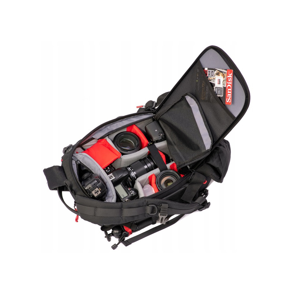 Hlavný priestor batohu môžete rozdeliť a prispôsobiť si zariadenie pomocou 7 priehradiek pripevnených suchým zipsom. Okrem toho môžete zariadenie medzi priehradkami zabezpečiť elastickou sieťkou na zips. Do tejto priestrannej hlavnej priehradky sa zmestí aj puzdro na dron s rozmermi 20 x 13 x 6 cm. Je tu dokonca miesto aj na puzdro na 13″ notebook alebo tablet. Celá hlavná priehradka je uzavretá zadnou časťou batohu, ktorá má na vnútornej strane ďalšie sieťované vrecko.