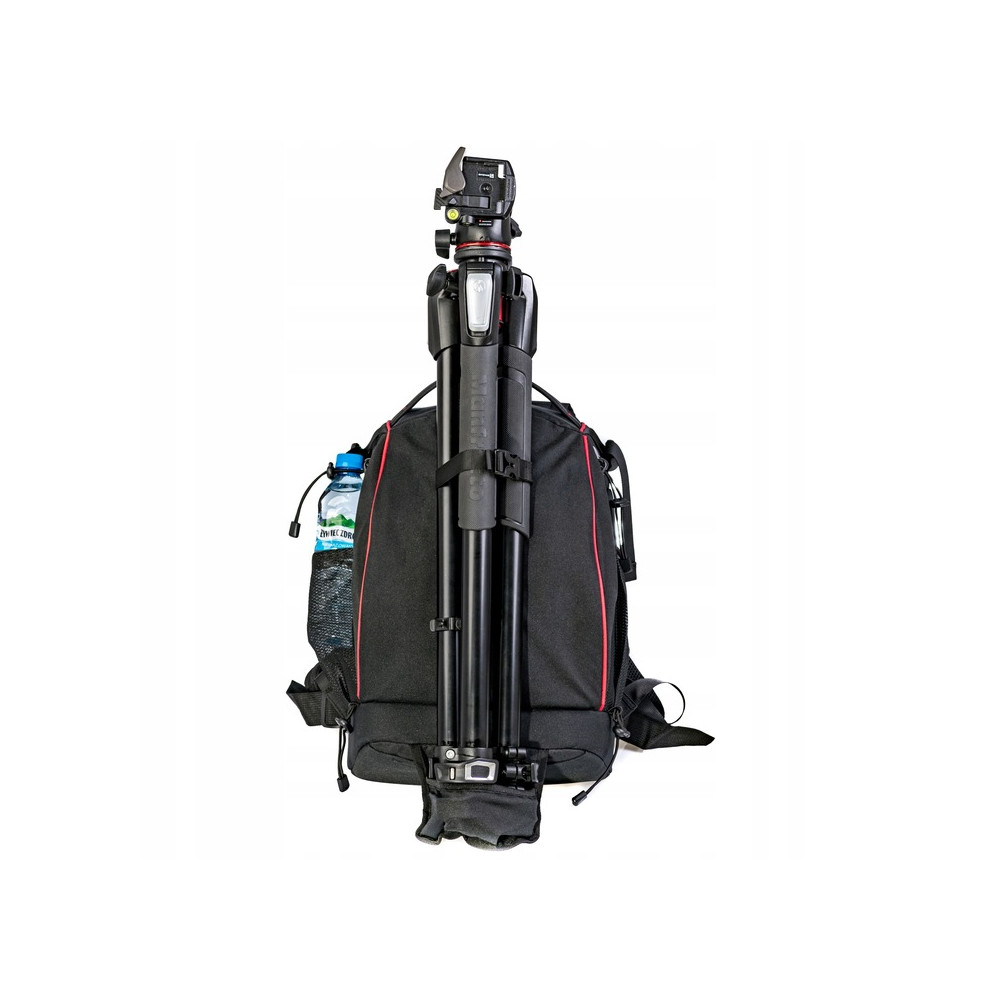 Po stranách sú dve sieťované vrecká na fľašu s vodou alebo statív. Nad každým vreckom sú popruhy na pripevnenie a zaistenie statívu.