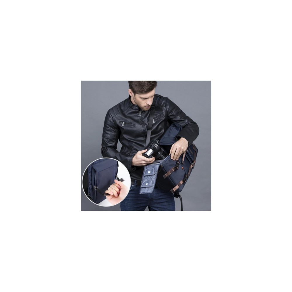 Funkčný, priestranný, dvojkomorový mestský fotobatoh K&F Concept. Určený na prenášanie dronu alebo fotoaparátu s jedným alebo dvoma objektívmi. Má aj vrecko na 15,6-palcový notebook a popruhy na pripevnenie statívu. Súčasťou je aj kryt proti dažďu. Tmavomodrá farba.