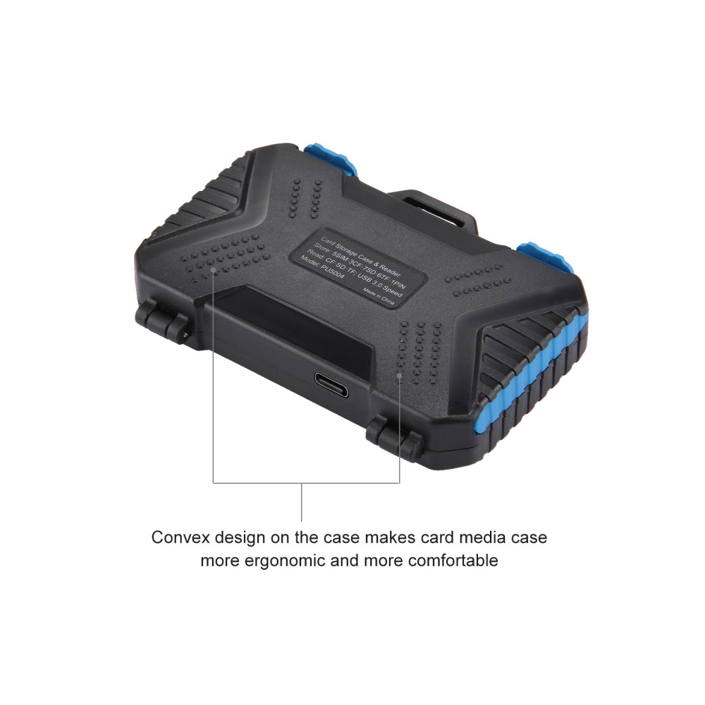 7. Puzdro je vybavené konektorom micro USB 3.0, môže slúžiť ako čítačka kariet na čítanie TF/CF/SD kariet.Modré vodotesné tesnenie z materiálu TPV zabraňuje vniknutiu nežiaducich nečistôt a vody do puzdra.