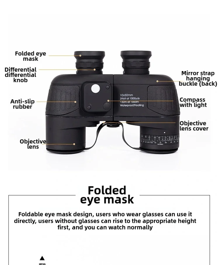 Vodotesný námorný ďalekohľad 10x50, s diaľkomerom, objektívom FMC, vonkajšou taškou na prenášanie. Extrémne jasný obraz Tento ďalekohľad je vybavený mimoriadne veľkým objektívom s priemerom 50 mm, objektív je úplne pokrytý širokopásmovou zelenou fóliou a bol použitý hranol BAK4 s vysokým indexom lomu. Váš superrealistický efekt obrazu.