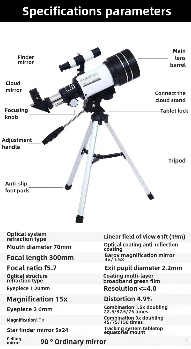 1. Clona: 70 mm (2,4″) 2. Ohnisková vzdialenosť: 300 mm (f/4) 3. Hybridná uhlopriečka: 90 stupňov 4. Rovníková montáž s nastavovacími kruhmi a ovládaním pomalého pohybu na osiach RA a Dec .5. Väčšia výška: 38 cm6. Štandardné 0,965" príslušenstvo zahŕňa: 7. Okuláre: H6 mm, H20 mm8, 3x Barlowova šošovka, 1,5x Erektor s hľadáčikom