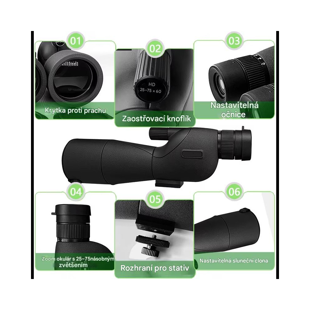 Tento ďalekohľad s plynulým rozsahomzväčšenia 25-75x a priemerom objektívu 60 mm vám umožní priblížiť sa k prírode ako nikdy predtým. Veľký objektív zaručuje, že aj pri slabom osvetlení uvidíte jasný a ostrý obraz, takže je ideálny na pozorovanie za súmraku alebo počas zamračených dní.