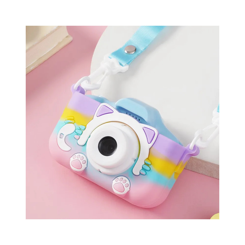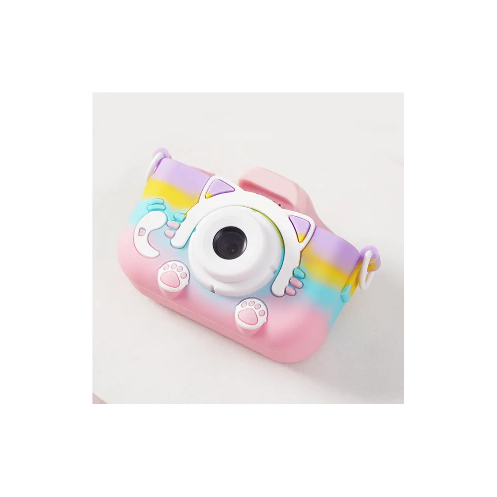 Mini detský digitálny fotoaparát s veľkosťou obrazovky 2,0 palca. Motívom je roztomilá mačka, okrem fotoaparátu je silikónové puzdro , 32 GB slot na TF kartu. Tento model je v dúhovej farbe.