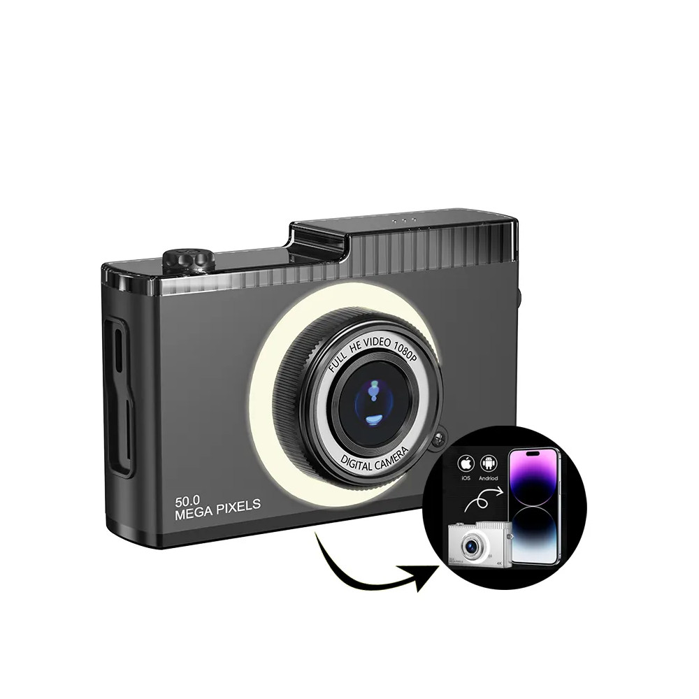 Digitálny fotoaparát s rozlíšením 50 Mpx, predná a zadná kamera, 2,4-palcová obrazovka. Video v rozlíšení 4K HD pre deti od 6 rokov a začiatočníkov. Tento model sa dodáva v čiernej farbe.