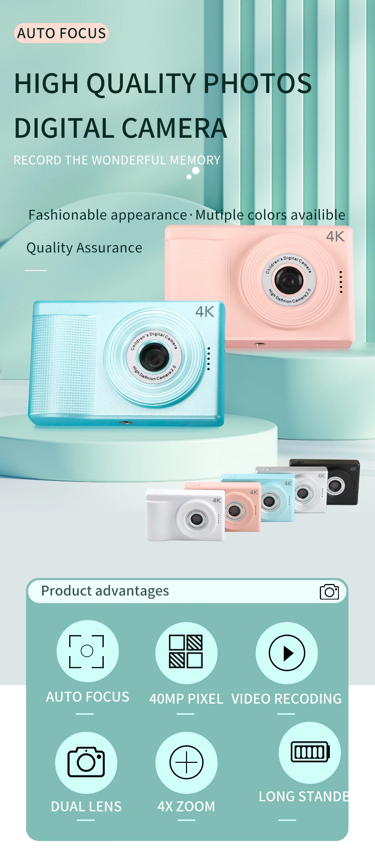 Detský digitálny minifotoaparát s rozlíšením 40 Mpx (predný a zadný fotoaparát) a rozlíšením videa 4KHD. Tento model je v svetlozelenej farbe. Môže fotografovať, nahrávať videá, MP3, hry, prehrávať hudbu. Jednoduché používanie. Určený pre deti od 6 rokov. Automatické zaostrovanie. Výdrž batérie až 8 hodín. 2,4-palcová obrazovka. Štvornásobný optický zoom.
