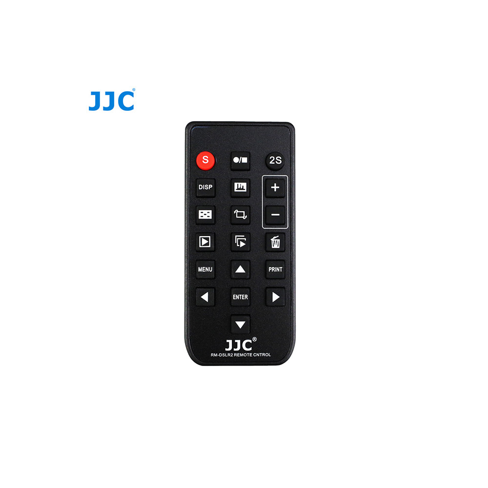 Infračervený diaľkový ovládač JJC RM-DSLR2 je multifunkčný diaľkový ovládač určený na nahradenie ovládačov Sony RMT-DSLR1 a RMT-DSLR2. Pomocou tohto diaľkového ovládania môžete na diaľku spustiť uzávierku fotoaparátu, uvoľniť uzávierku s 2-sekundovým oneskorením a spustiť/zastaviť nahrávanie videa. Keď je fotoaparát pripojený k televízoru, môžete tiež ovládať prehrávanie snímok, zväčšovať alebo zmenšovať veľkosť prehrávania a sledovať prezentáciu na televízore. Keď je fotoaparát pripojený k tlačiarni kompatibilnej s PicBridge, môžete počas prezerania snímok na televízore tlačiť snímky (táto funkcia funguje len vtedy, keď je fotoaparát pripojený k HDTV pomocou kábla HDMI) stlačením tlačidla PRINT na diaľkovom ovládači.