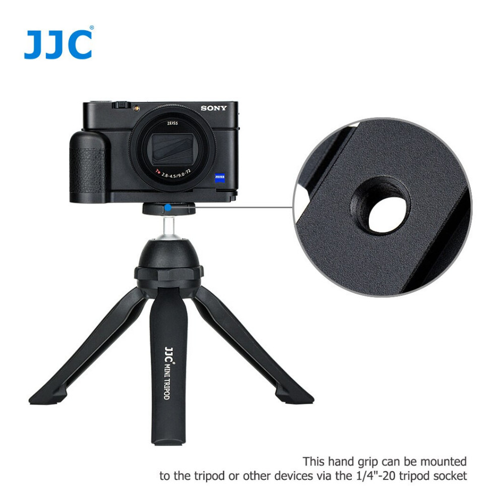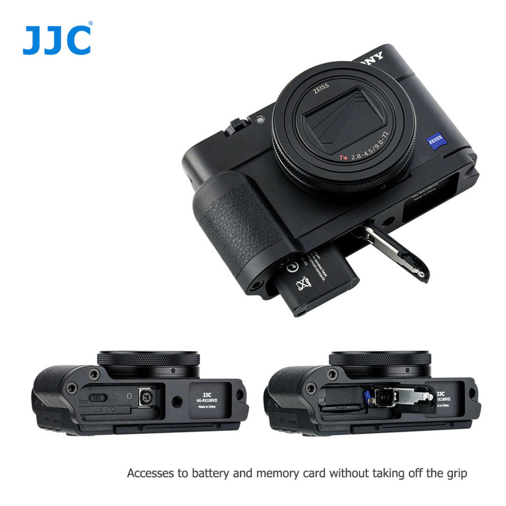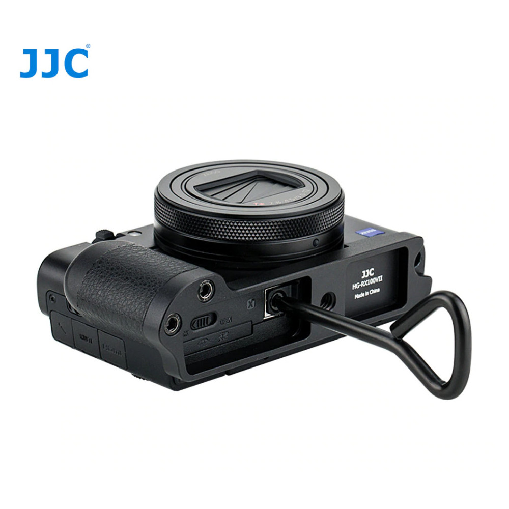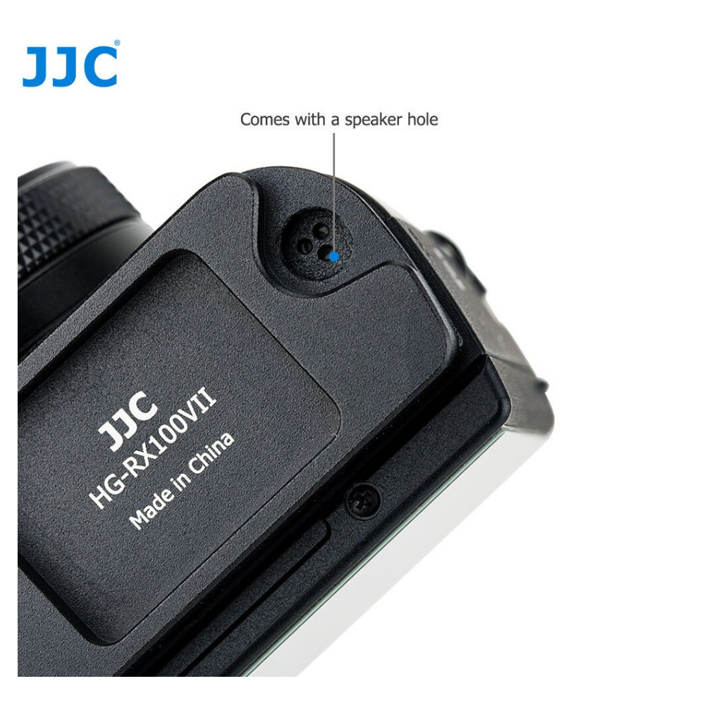 Držiak JJC HG-RX100VII. Je vyrobený z prvotriednej hliníkovej zliatiny, ktorá je pevná a odolná. Táto kovová konštrukcia je zároveň dokonalým spojením s telom fotoaparátu. rukoväť je protišmyková a vďaka koži z mikrovlákna na jej povrchu vám poskytne príjemný pocit v ruke. Po pripevnení rukoväte k fotoaparátu si pri fotografovaní užijete pohodlnejší a bezpečnejší úchop. Veľký otvor v spodnej časti umožňuje vybrať batériu bez nutnosti demontáže celej rukoväte. Je tiež vybavená otvorom pre reproduktor na ľahký prístup k reproduktoru fotoaparátu. V spodnej časti rukoväte sa nachádza rýchloupínacia doštička typu Arca Swiss, ktorá je určená na priame pripojenie k statívom systému Arca Swiss.