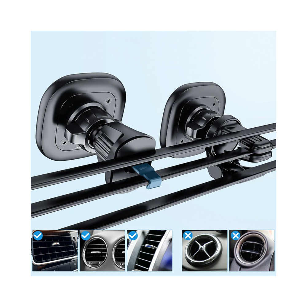 Inštalácia držiaka VRIG MG-07S je intuitívna a rýchla. Jednoducho ho pripevnite k ventilačnému otvoru vášho vozidla. Súprava obsahuje dva vymeniteľné držiaky: jeden s klipom a dodatočnou oporou a druhý s nastaviteľným hákom. Vďaka guľovej hlave môžete ľahko meniť polohu telefónu podľa potreby, čo je ideálne na navigáciu pomocou Google Maps alebo Apple Maps.