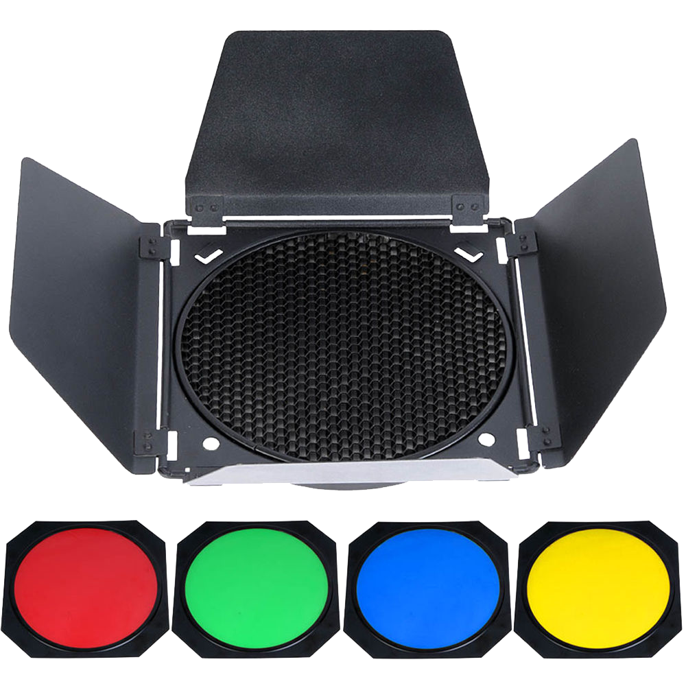Godox BD-04 je súprava dverí Barndoor s voštinovou mriežkou a 4 farebnými filtrami pre štandardný reflektor.