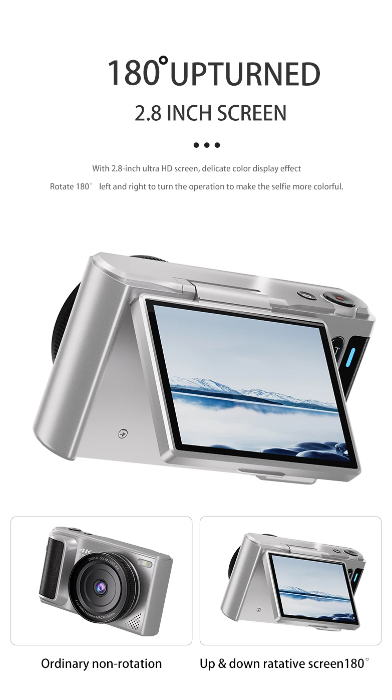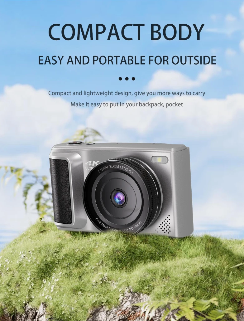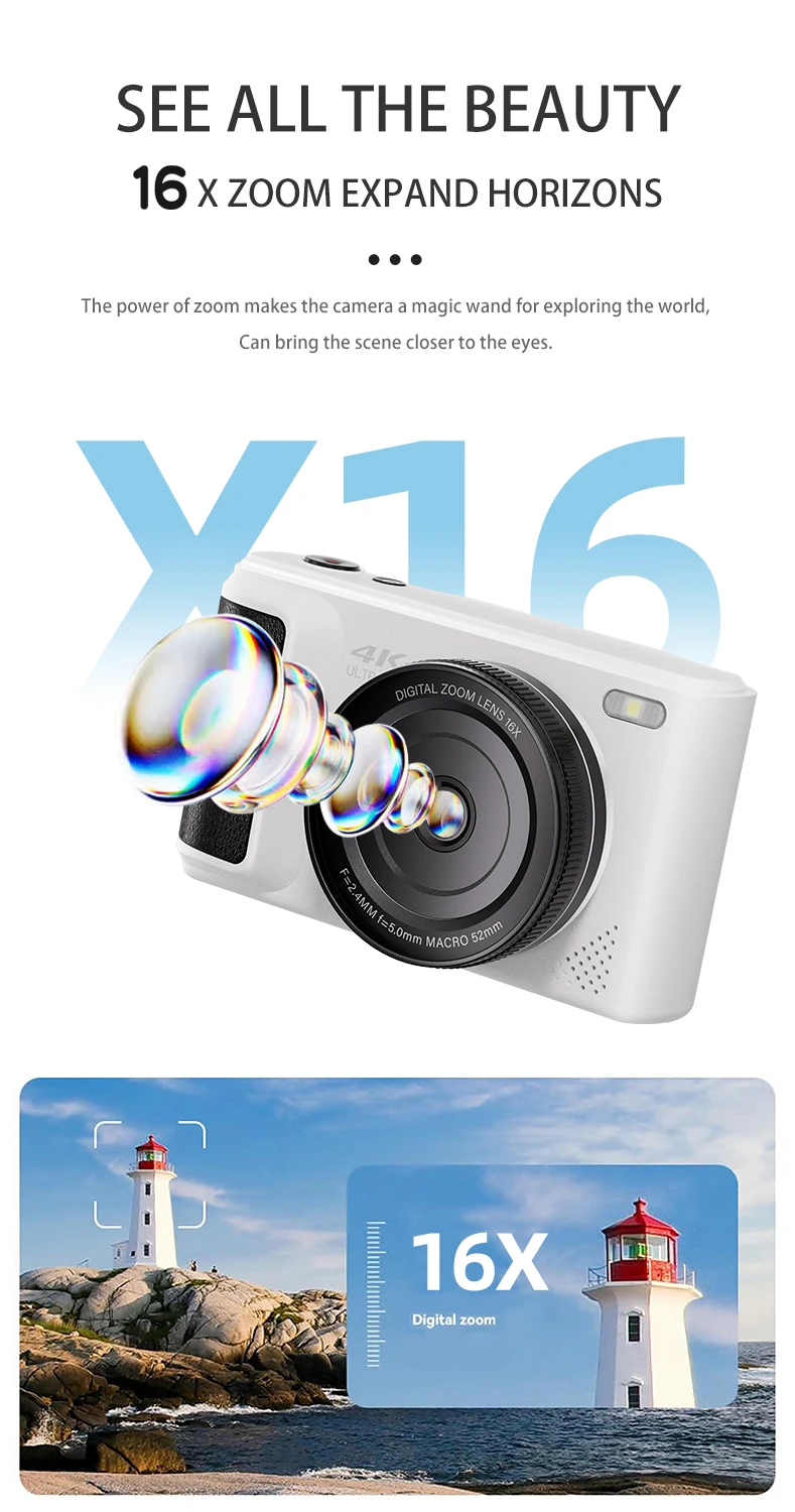 Digitálny fotoaparát v retro štýle pre začiatočníkov s nahrávaním videí v rozlíšení 4K, snímaním s rozlíšením až 64 Mpx, 16-násobným 1-násobným optickým zoomom.