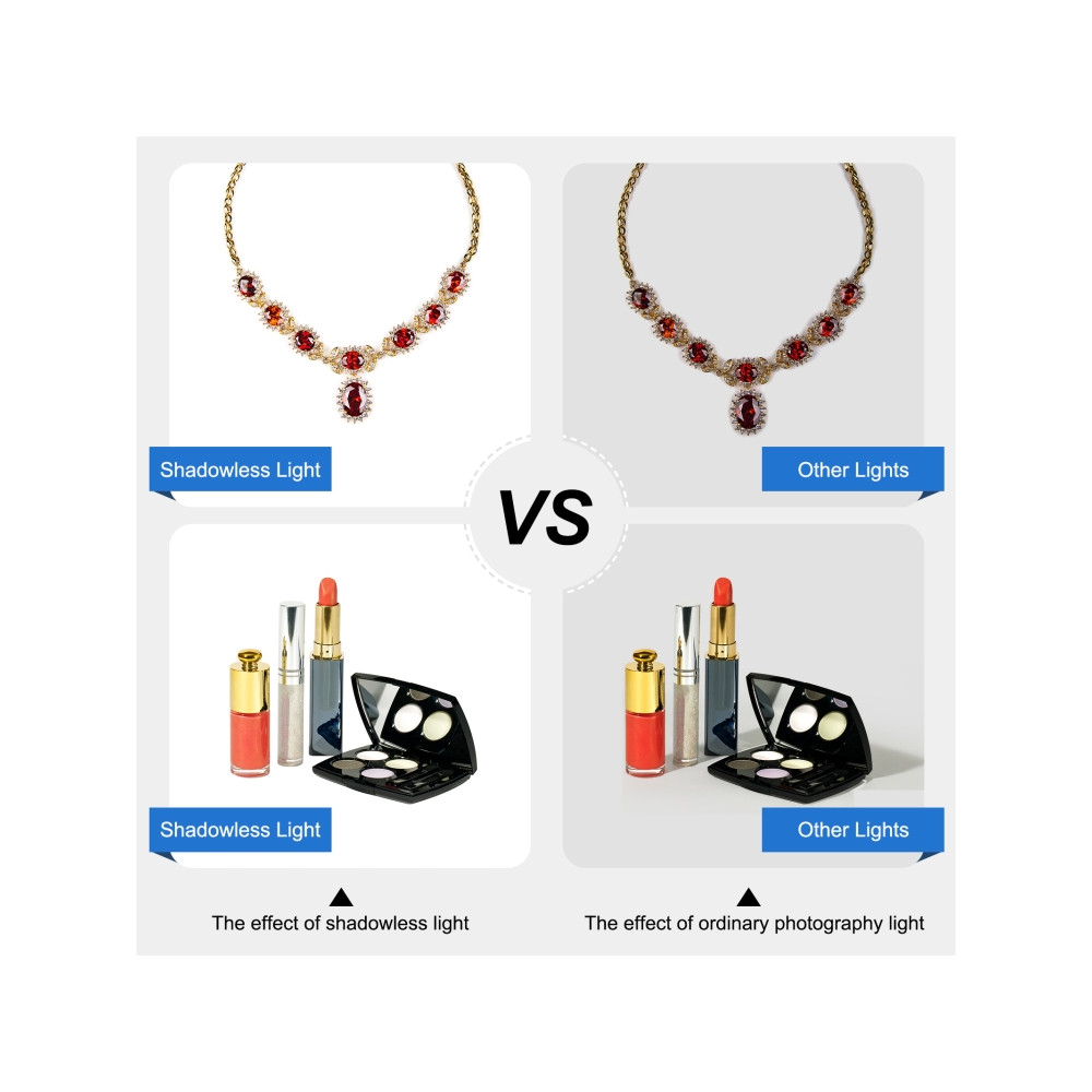 Je ideálny na komerčné fotografovanie širokej škály produktov vrátane šperkov, kozmetiky, modeliek, umeleckých diel, skla, elektronických zariadení a módnych doplnkov. Či už ste profesionálny fotograf alebo nadšenec, tento panel vám poskytne nástroje, ktoré potrebujete na dosiahnutie ostrých a jasných snímok bez nežiaducich tieňov.
