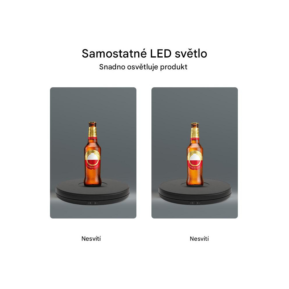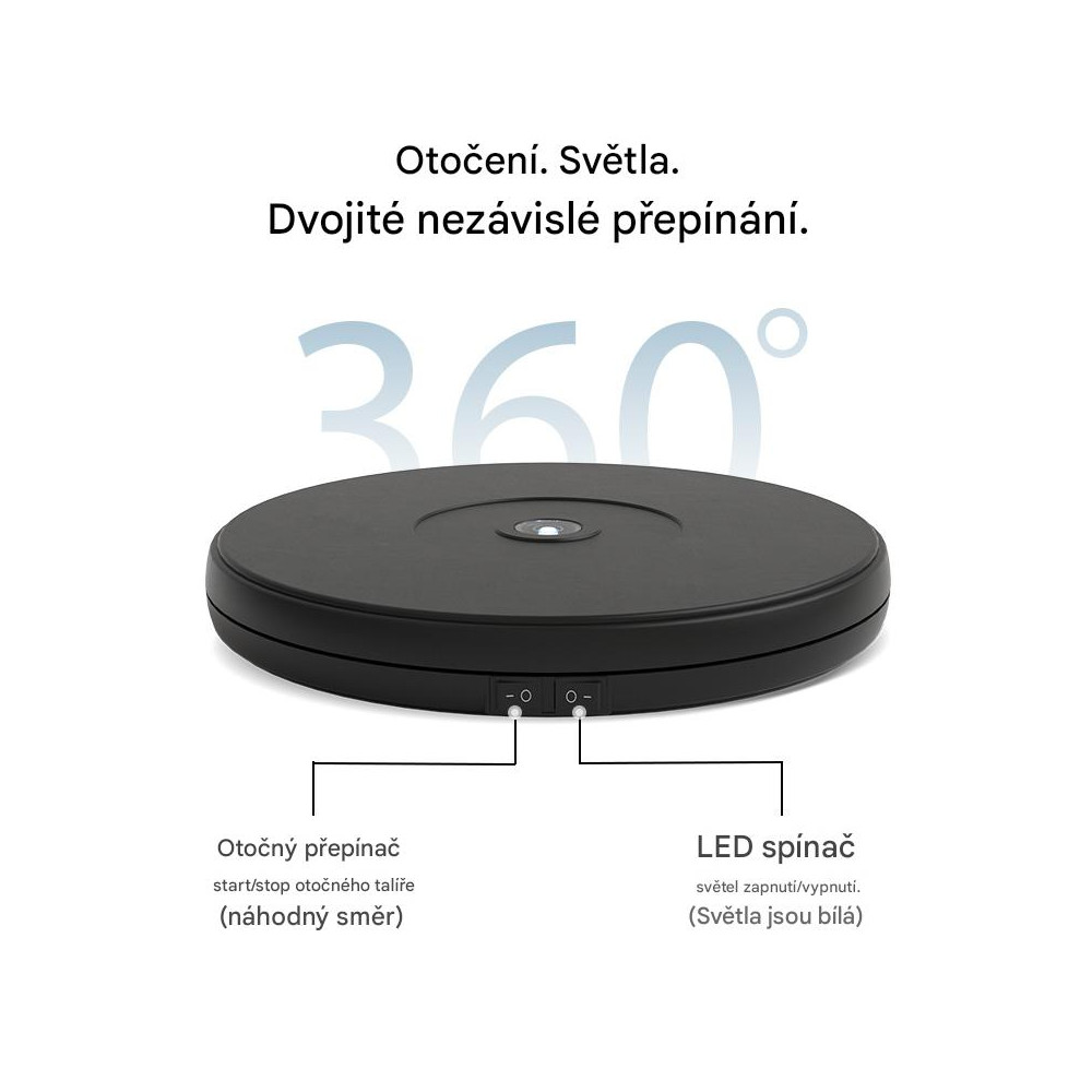 Stojan je vybavený funkciou otáčania v oboch smeroch, čo umožňuje flexibilné nastavenie uhla pohľadu. Ovládanie je jednoduché vďaka dvom spínačom umiestneným na prednej strane - jeden slúži na ovládanie otáčania, zatiaľ čo druhý ovláda osvetlenie LED. Tieto LED svetlá poskytujú rovnomerné osvetlenie, čím zabezpečujú, že každý detail vášho výrobku bude zachytený v najlepšej kvalite.