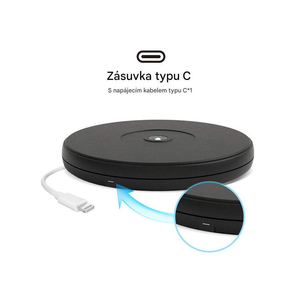 Rýchlosť otáčania je nastavená tak, že jedno úplné otočenie trvá približne 40 sekúnd, čo je ideálne na zachytenie detailných snímok z každého uhla. Napájanie je zabezpečené prostredníctvom kábla USB-C, čo zaručuje jednoduchú kompatibilitu s modernými zariadeniami. Sieťový adaptér nie je súčasťou balenia, čo vám dáva možnosť vybrať si spôsob napájania zariadenia.