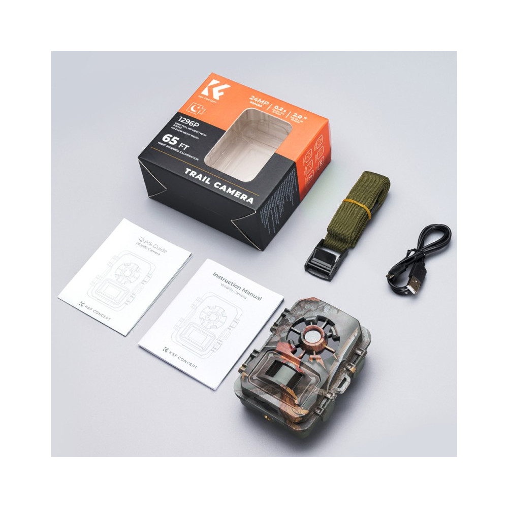 K&F Concept A101XS KF35.061 je malá, ľahko použiteľná lesná kamera. Sníma fotografie a videá v rozlíšení 24 MP (formát 2304 × 1296p). Uhol záberu 80°, snímač pohybu, záznam zvuku a režim nočného videnia z nej robia užitočný nástroj na pozorovanie divokej prírody. Stupeň krytia IP66 ju chráni pred prachom a dažďom. Dosah snímača pohybu je až 24 m. Na správnu prevádzku si zariadenie vyžaduje inštaláciu pamäťovej karty SD a štyroch batérií AA (nie sú súčasťou dodávky).