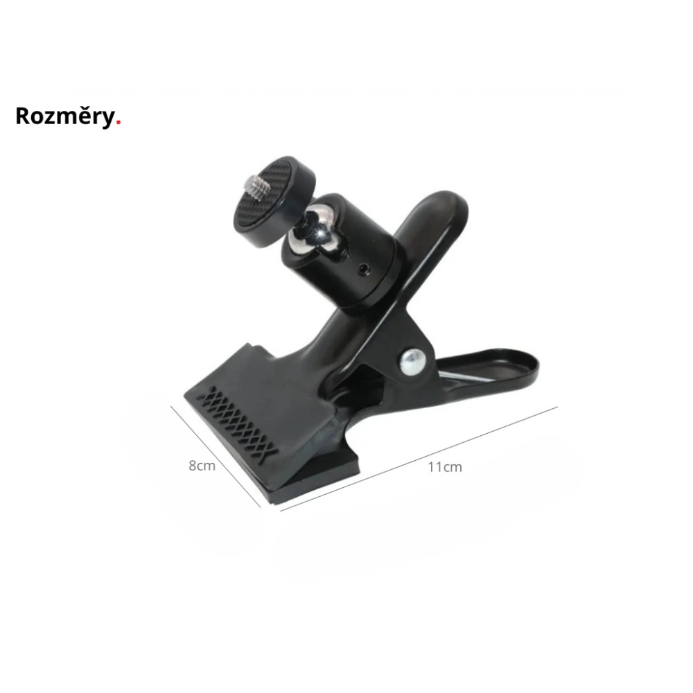Kovová svorka so silnou pružinou a guľovou hlavou so skrutkou 1/4. Okrem toho je k dispozícii adaptér na skrutku Cold shoe na montáž zariadení, ktoré používajú tento systém. Spoľahlivý nástroj na upevnenie rôznych vecí, ako sú blesky, osvetlenie a podobne. Rýchle a pevné upevnenie.