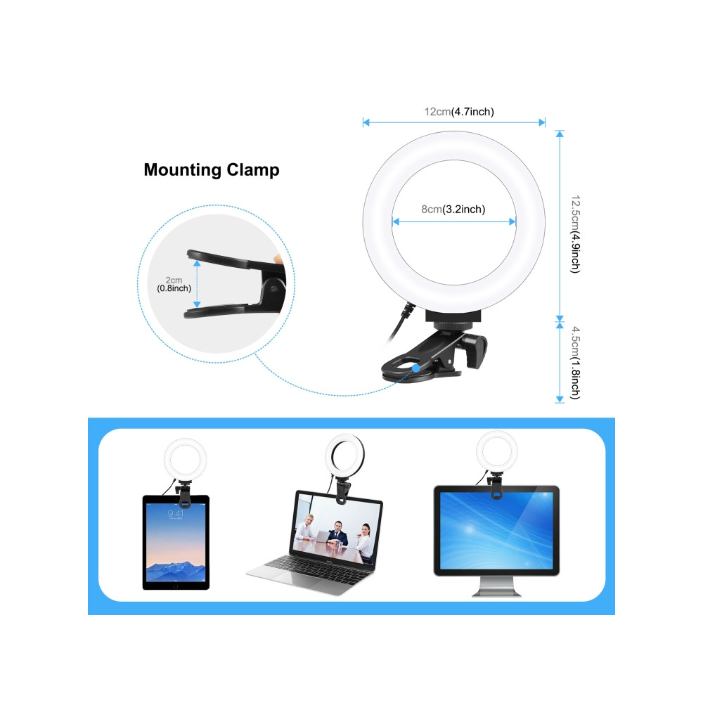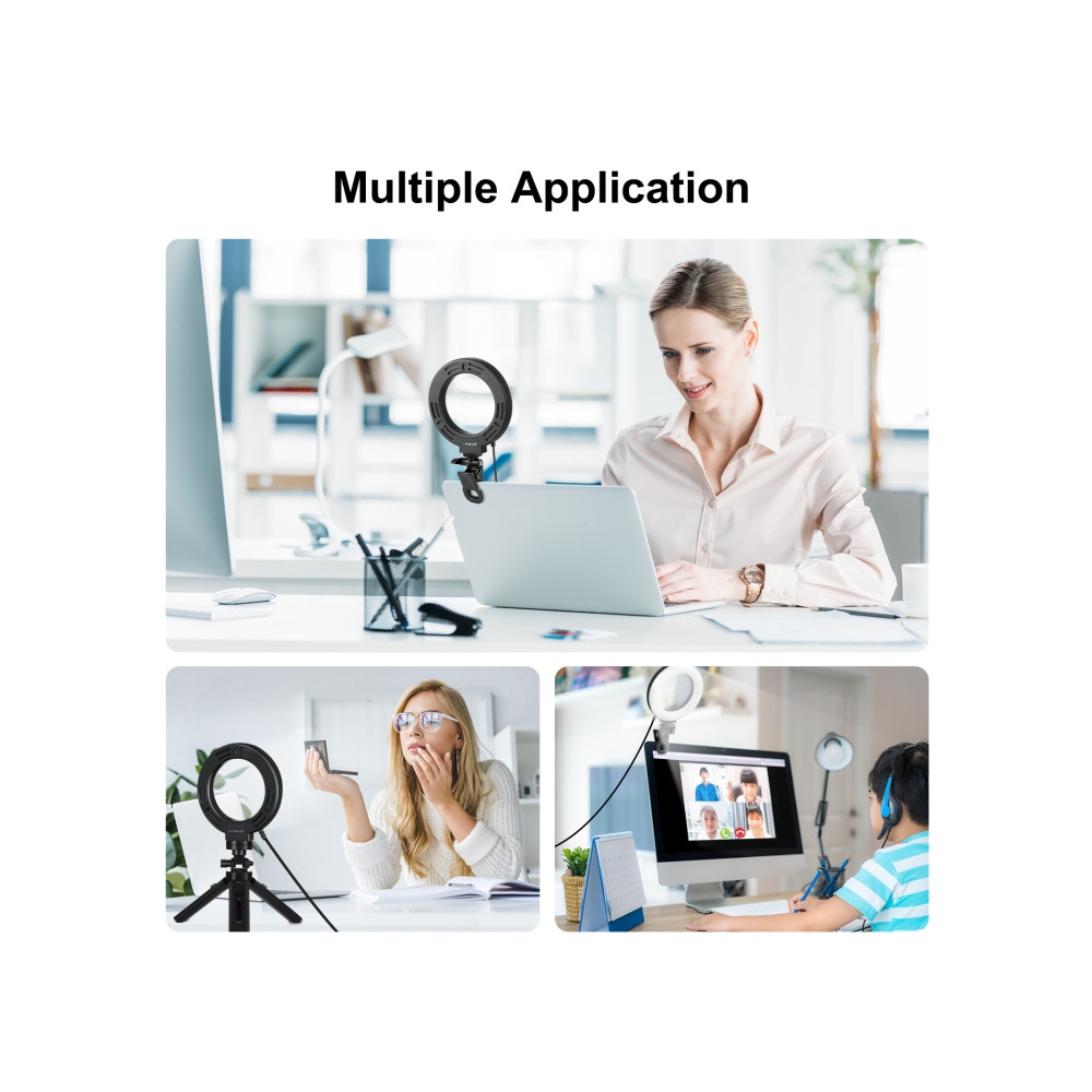 Kruhové svetlo sa dá jednoducho namontovať na statív pomocou 1/4" skrutky, čo umožňuje jeho použitie kdekoľvek, v interiéri aj exteriéri. Statív nie je súčasťou balenia, ale vďaka kompaktnému dizajnu a montážnej svorke proti poškriabaniu môžete svetlo namontovať na rôzne povrchy, ako sú stoly, notebooky, stoličky, postele, konferenčné stolíky a dokonca aj monitory počítačov. Otvor svorky do 2,4 cm zaisťuje pevnú stabilitu.