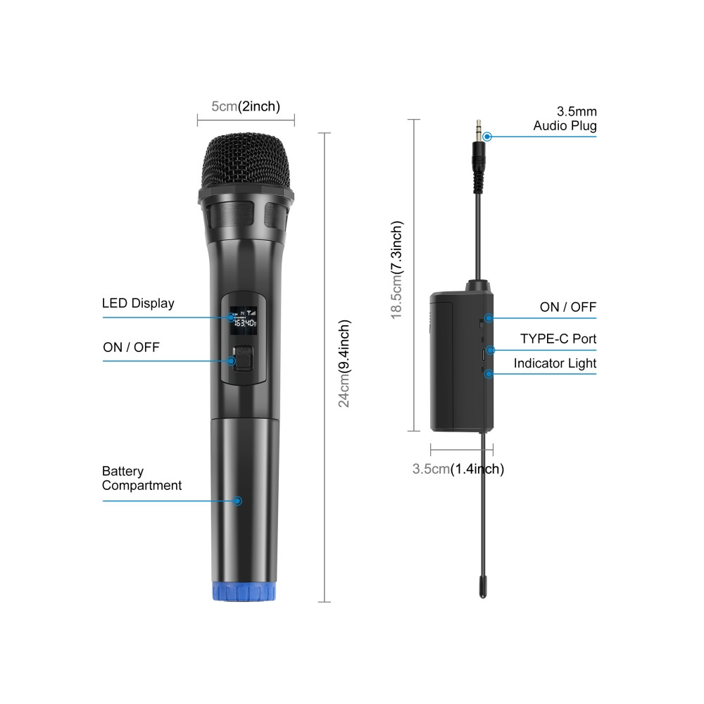 3. Vďaka bezdrôtovému zapojeniu Plug and Play, automatickému párovaniu frekvencií, ručnému mikrofónu napájanému batériou AA a prijímaču napájanému lítiovou nabíjateľnou batériou 18650 je prenosný (Poznámka: batérie AA a 18650 nie sú súčasťou balenia)