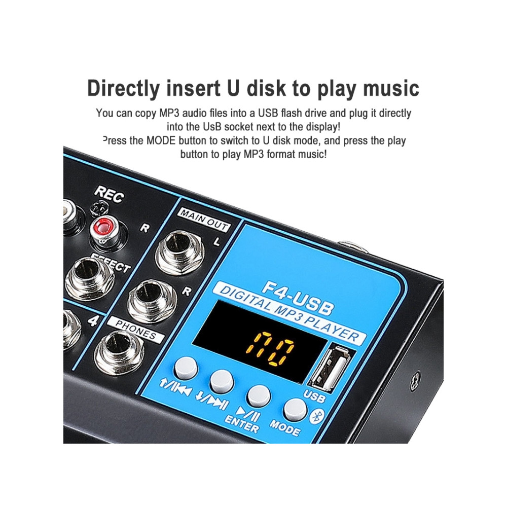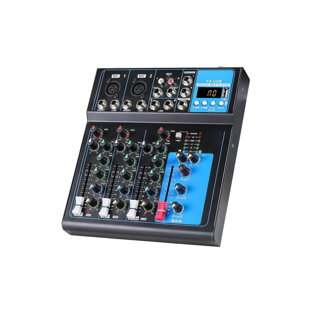 Mixážny pult F4 je ideálnou voľbou pre tých, ktorí hľadajú spoľahlivý a výkonný nástroj na správu zvuku s modernými technológiami, ako sú Bluetooth a prehrávanie cez USB. Jeho robustná konštrukcia a široká škála funkcií z neho robia ideálneho partnera pre každú hudobnú príležitosť.