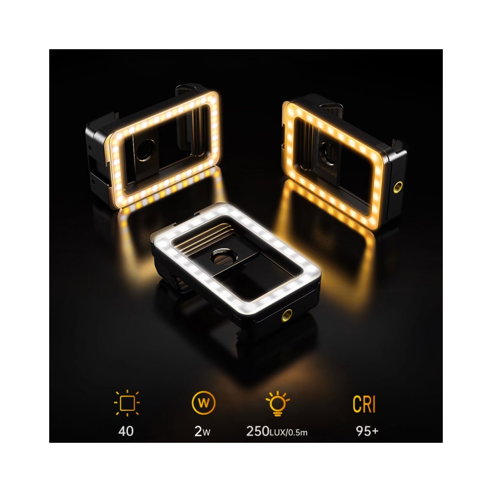 Súprava obsahuje univerzálnu montážnu konzolu, ktorá je navrhnutá tak, aby sa ľahko prispôsobila rôznym veľkostiam telefónov s rozsahom nastavenia svorky od 50 do 90 mm. Tento držiak je vybavený 1/4" vnútorným závitom, ktorý umožňuje jednoduché pripevnenie k statívu, a studeným držiakom na pripevnenie ďalšieho príslušenstva. Integrované osvetlenie 40 LED poskytuje dostatok svetla pre vaše snímky aj pri slabom osvetlení. Trojstupňové nastavenie svetelného výkonu a teploty farieb (2700 - 6500 K) umožňuje prispôsobiť osvetlenie aktuálnym potrebám, takže je ideálne na rôzne fotografické situácie.