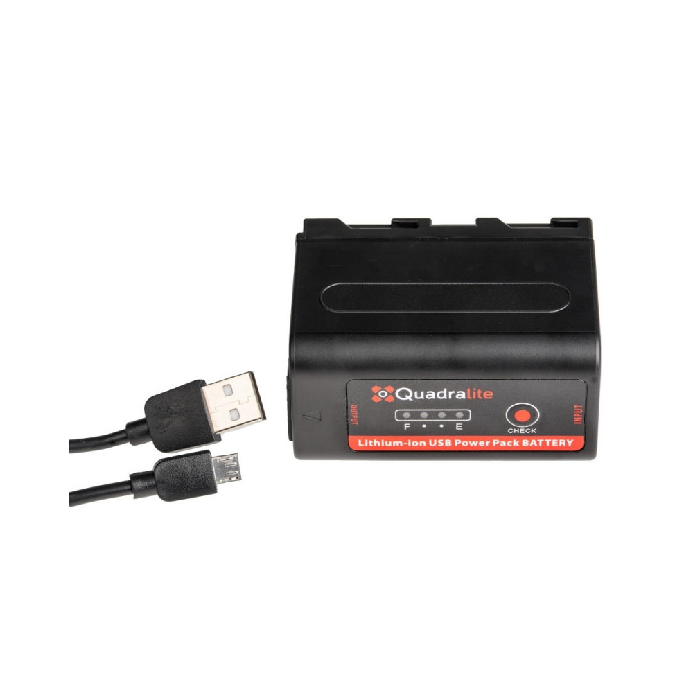 Quadralite NP-F750Pro-USB je nabíjateľná batéria pre akékoľvek zariadenie napájané populárnymi batériami NP-F750 od spoločnosti Sony. Umožňuje mobilné používanie mnohých lámp a panelov LED, vďaka čomu môžete vytvoriť filmovú alebo fotografickú scénu v exteriéri a odstrániť problém so zamotanými káblami. Batériu NP-F970 možno použiť aj na používanie viacerých fotoaparátov. batéria Quadralite NP-F750Pro-USB je vyrobená z vysokokvalitných článkov s reálnou kapacitou 7800 mAh. Je vytvorená lítiovo-iónovou technológiou a nemá negatívny pamäťový efekt. Batéria NP-F750Pro-USB sa nabíja pomocou priloženého kábla USB a batériu môžete nabíjať bez toho, aby ste ju museli najprv úplne vybiť.