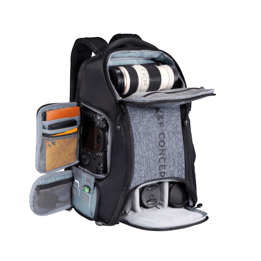Batoh na fotoaparát K&F Conceptje navrhnutý tak, aby poskytoval maximálnu flexibilitu pri organizácii vášho vybavenia. Horný oddiel je ideálny pre veľký objektív alebo dron, stredný oddiel pojme dva fotoaparáty alebo ďalšie objektívy a spodný oddiel je vhodný pre tri objektívy alebo jeden fotoaparát s ďalším sklom. Nastaviteľné priehradky umožňujú prispôsobiť vnútro batohu vašim potrebám.