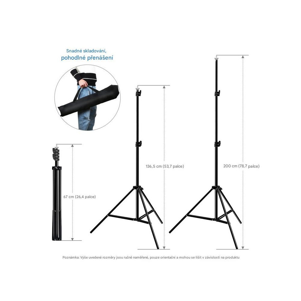 Súprava má ľahkú konštrukciu z nosných kovov, ktorá zaručuje nielen odolnosť, ale aj ľahkú prenosnosť. Vďaka tomu je ideálna pre fotografov, ktorí často cestujú alebo potrebujú rýchlo meniť miesta fotografovania. Nastaviteľná výška až do 200 cm umožňuje jednoduché prispôsobenie vašim potrebám, či už pracujete v interiéri alebo v exteriéri. Ergonomický gombík na statíve umožňuje rýchle a bezpečné nastavenie výšky a zabezpečuje stabilitu počas celého fotografovania.
