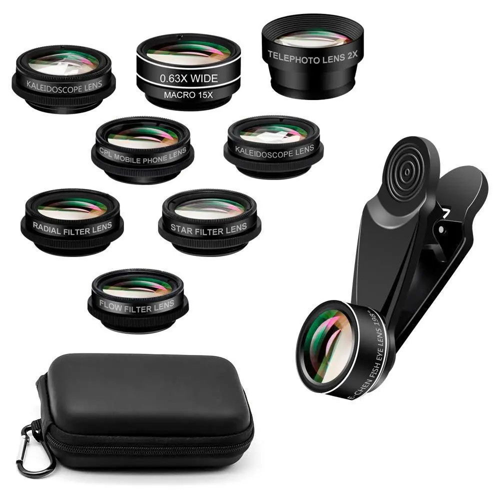198° rybie oko + 0,63 x širokouhlé + 15 x makro + 2 x zoom + CPL polarizované + zrkadlo kaleidoskopu + svetlo hviezd + tečúca voda + žiara + trojbodový scenár + klip + puzdro