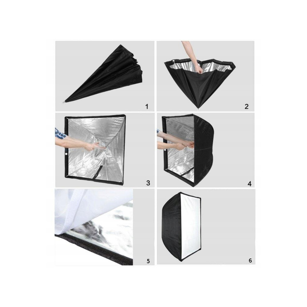 Softboxsa rozkladá a skladá rovnako akodáždnik, čo výrazne uľahčuje jeho používanie. Tento mechanizmus umožňuje rýchle nastavenie a zloženie, čo šetrí čas a energiu, najmä pri fotografovaní v teréne.