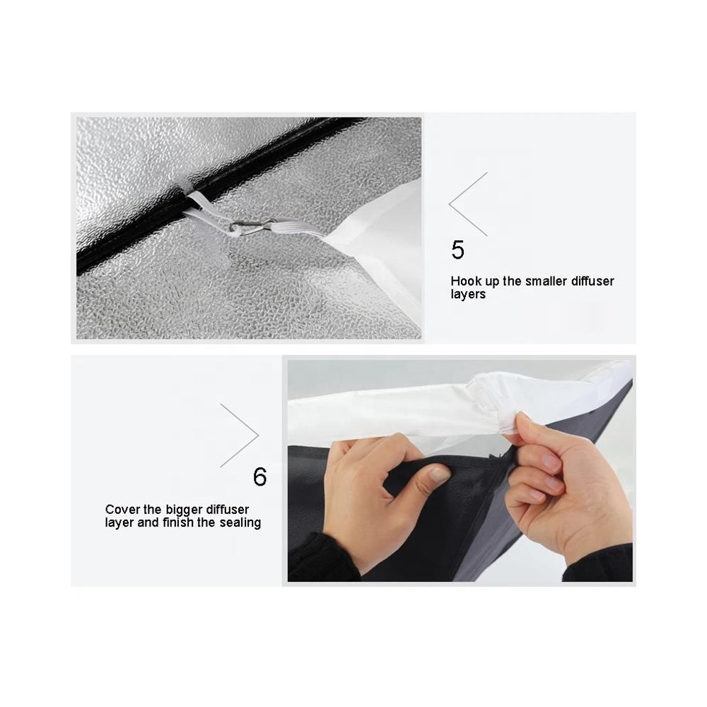 Vo vnútri softboxu sa nachádzajú dve vrstvy difúzorov - vnútorná a vonkajšia. Tieto difúzory zabezpečujú rovnomerné rozloženie svetla, minimalizujú ostré tiene a vytvárajú mäkké a prirodzené osvetlenie. Vďaka tomu získajú vaše fotografie profesionálny vzhľad s dokonalou expozíciou.