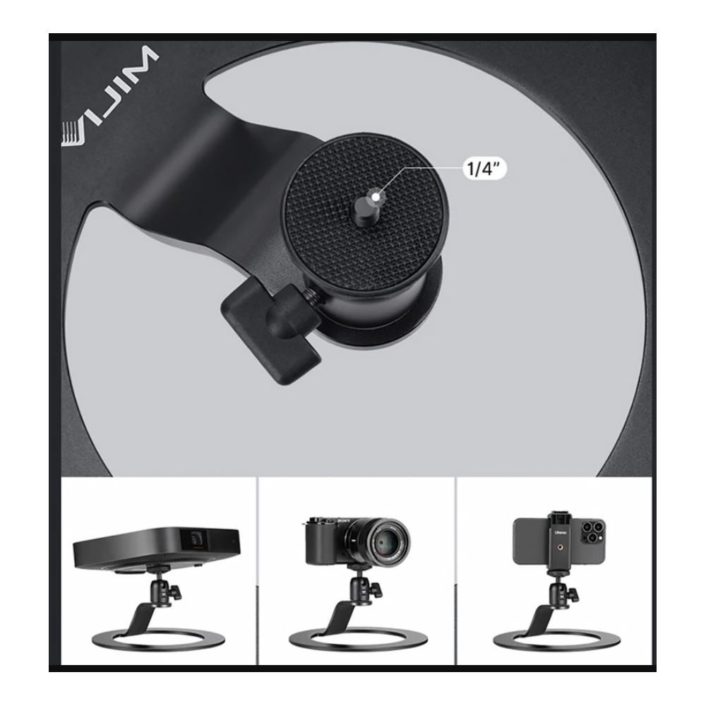 Ulanzi VIJIM LT04 je malý stolný statív s guľovou hlavou určený na upevnenie fotoaparátu, videokamery, držiaka na telefón alebo projektora. Široká okrúhla základňa s protišmykovými prvkami zaručuje bezpečné a stabilné upevnenie zariadenia a guľôčkové ložisko umožňuje jeho voľný náklon. Priemer základne - 19,5 cm. Maximálna nosnosť - 5 kg.