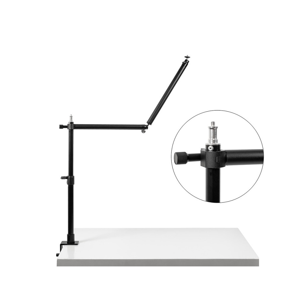 Vďaka 16 mm štúdiovej hlave so závitom 1/4'' je statív ideálny nielen na upevnenie štúdiových lámp, ale aj kruhových alebo kozmetických svietidiel. Svorka umožňuje montáž na pracovnú plochu s maximálnou šírkou 9 cm, čím poskytuje stabilnú základňu pre akékoľvek zariadenie, ktoré potrebujete mať po ruke.