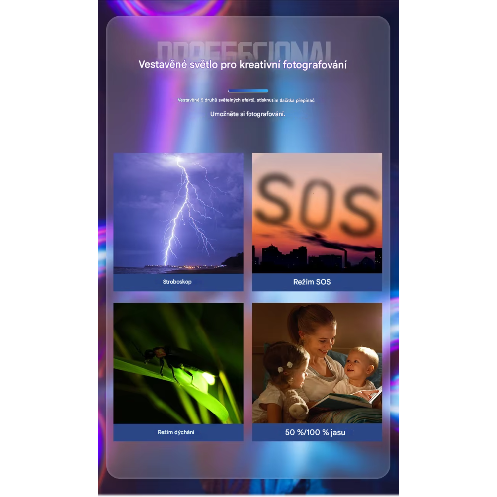 JSL-1000X ponúka päť typov vstavaných svetelných efektov vrátane stroboskopu, SOS a režimov 50 % a 100 % jasu. Tieto efekty vám umožňujú pridať kreatívne prvky do vašich projektov a ľahko prispôsobiť osvetlenie aktuálnym potrebám.