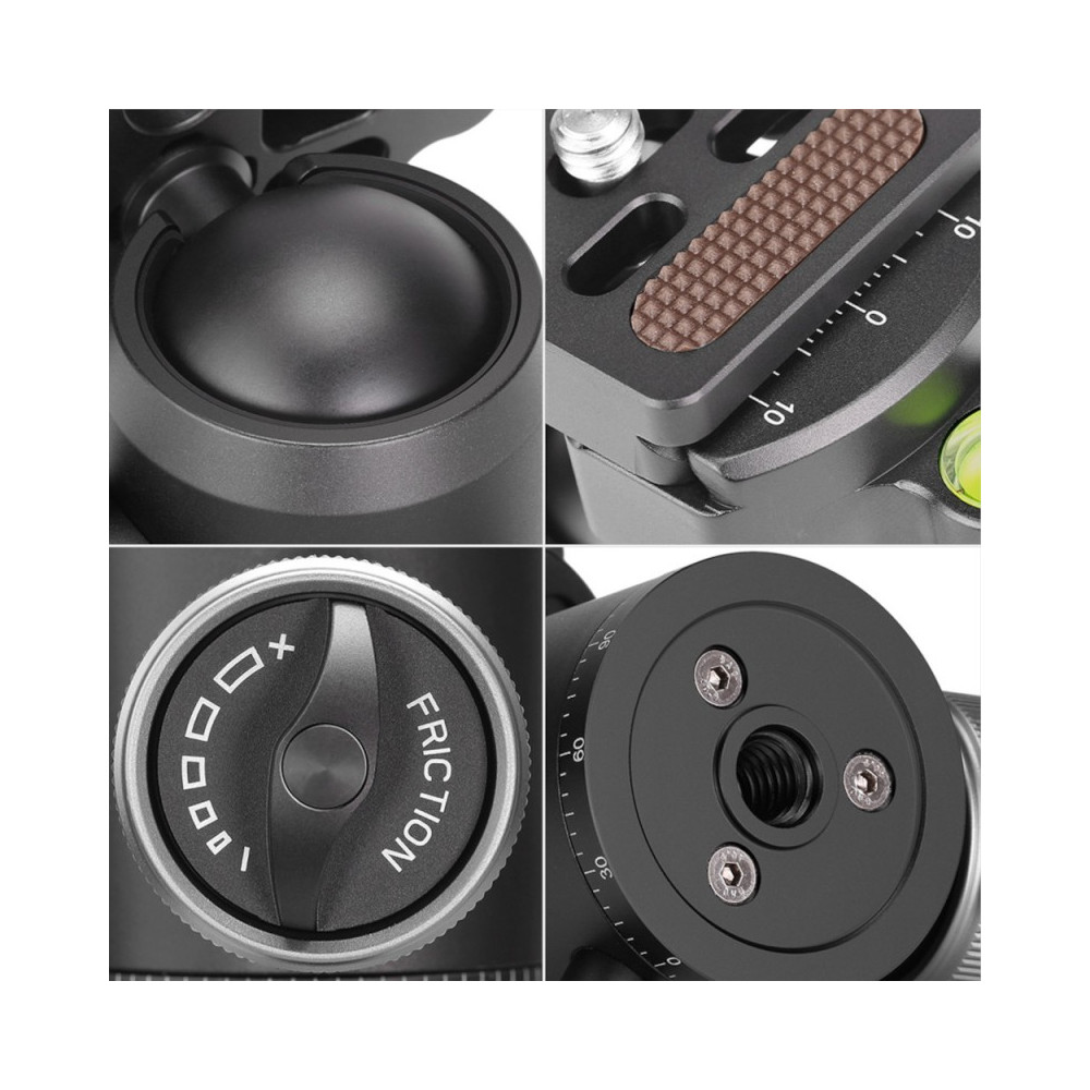 Medzi kľúčové funkcie guľovej hlavy patrí zámok otáčania, ovládanie napätia a laserom vyrytá stupnica na presné vycentrovanie. Statív je vynikajúcou voľbou na fotografovanie krajiny, makrofotografiu a cestovanie.